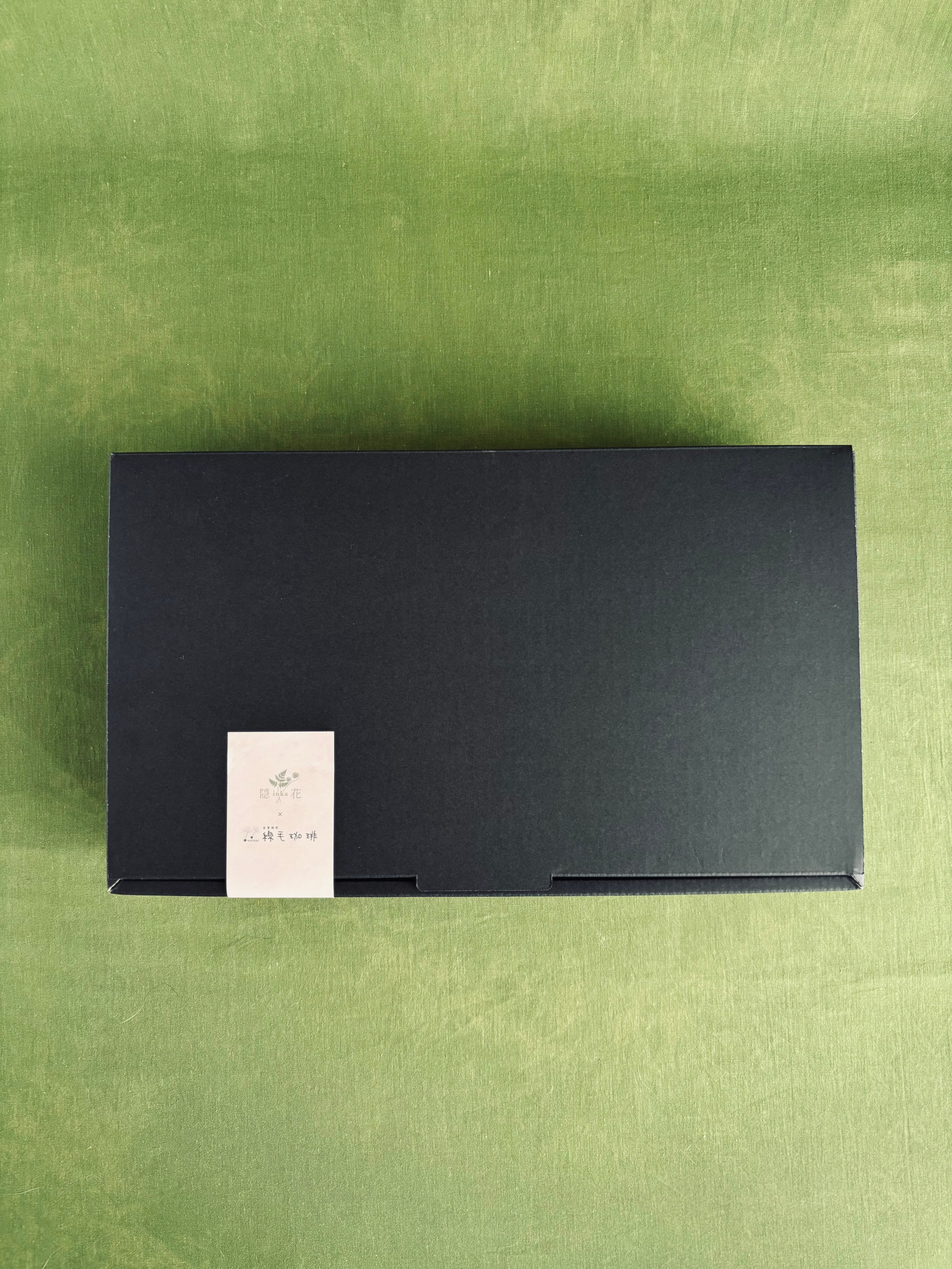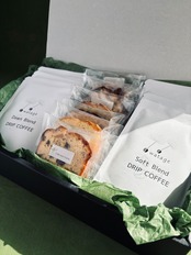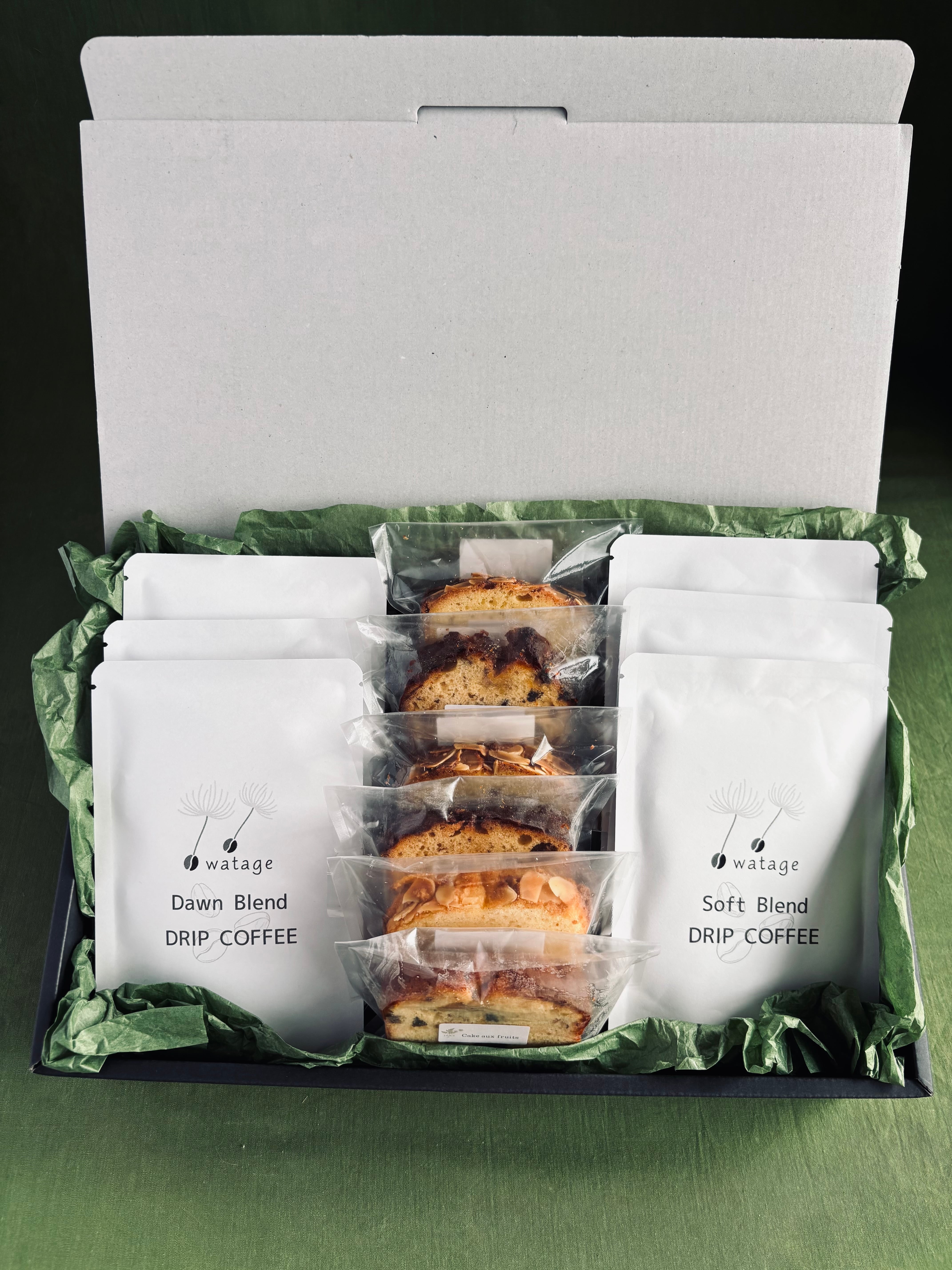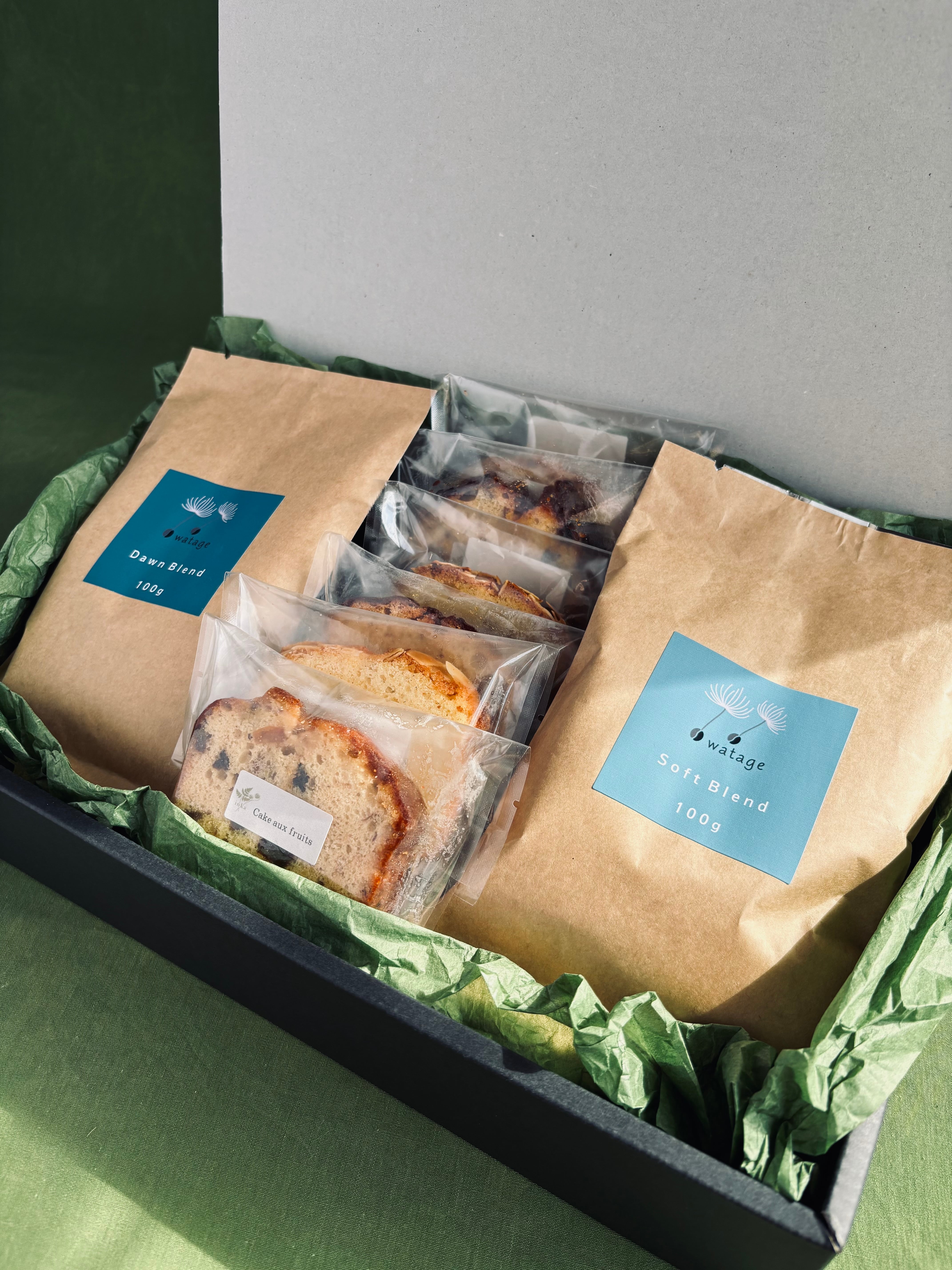 隠花よりケーク2種各3個、綿毛珈琲より自家焙煎珈琲2種の詰め合わせギフトボックスです。
